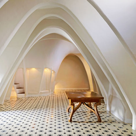 El Desván es un emblemático espacio construido con una de las soluciones más elegantes y originales de Antoni Gaudí: el arco catenario. La sucesión de arcos en la bóveda de la Sala Principal evoca a la caja torácica de un gran animal, mientras que el revoque en yeso dota a los eventos de una atmósfera futurista, única e irrepetible de gran belleza. En el desván también se encuentra otro magistral espacio cuyo sistema de iluminación lleva la firma del alemán Ingo Maurer. Esta planta se proyectó como área de servicio, donde se ubicaban los trasteros y lavaderos de cada una de las viviendas de este genial edificio modernista. El Desván y la Azotea se alquilan de manera conjunta.